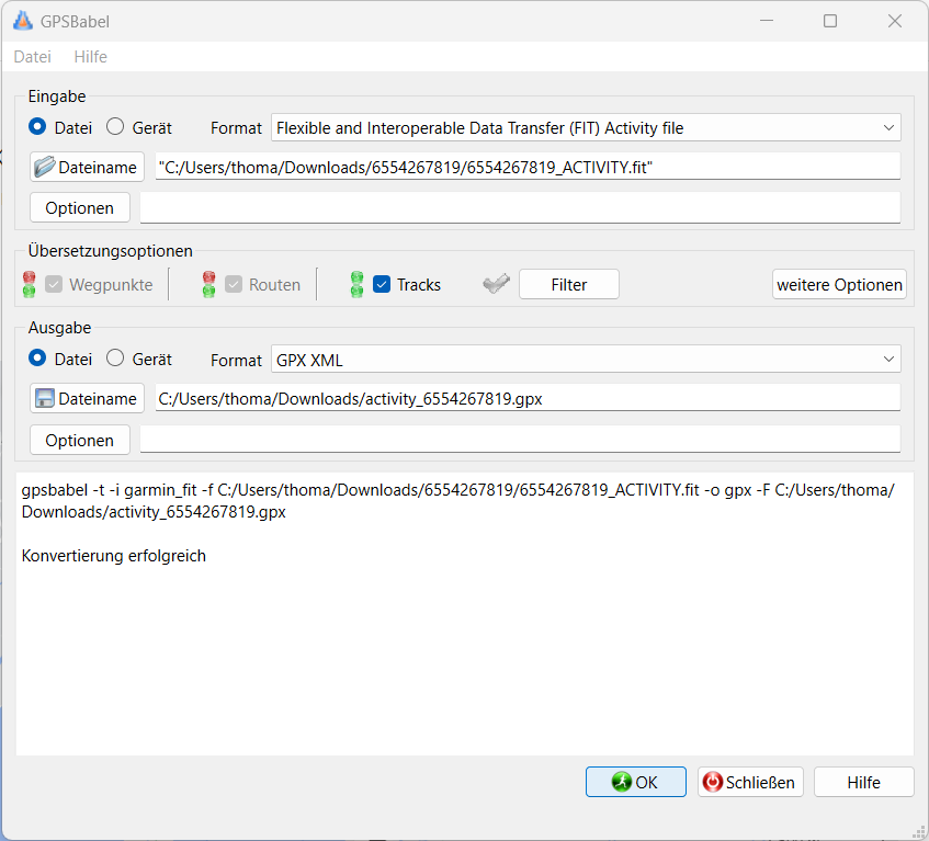 GPSBabel fand ich auf den ersten Blick nicht super-selbsterklärend und musste ein wenig herumprobieren. Hier eine Kurzanleitung, falls noch jemand das Problem hat: