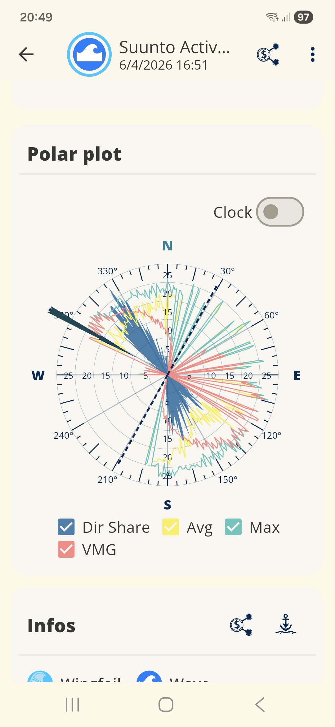 La direction du vent est calculée à partir des données de mouvement GPS, ce qui peut produire des résultats inexactes lorsque le signal est bruyant — ce qui est courant lors des sessions de vagues avec de nombreux changements de direction.